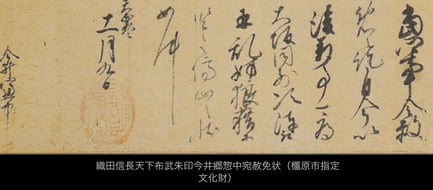 織田信長天下布武朱印今井郷惣中宛赦免状(橿原市指定文化財)